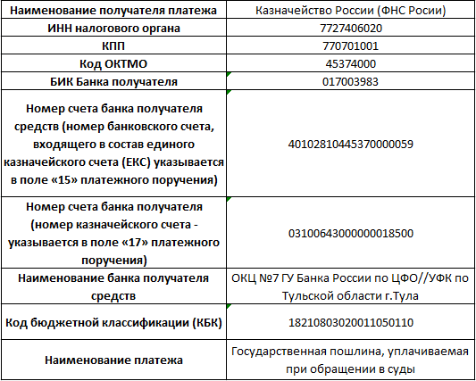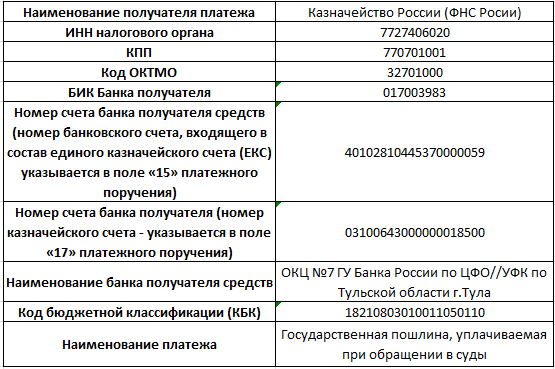 Реквизиты оплаты государственной пошлины при